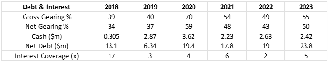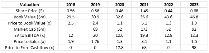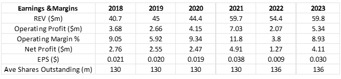 FY22 was their worst year for some time with profits falling from $2.4m in FY20, $4.9m in FY21 to $1.27m. FY23 has seen profits return to previous levels coming in at $4.1m, indicating that things are on the improve and the worst is behind them. This has been reflected in their share price as it has gone from circa high of $1.40, low of 40c, to its current 63c, in this time.