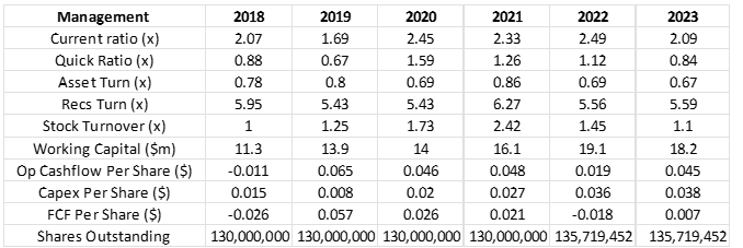 Management have performed well with the key liquidity ratios all remaining relatively consistent and at solid levels for an engineering company; Generally engineering firms have longer product cycles and therefor cash cycles than most companies. This is due to the longer time frames and higher costs associated with R&D, sales, manufacturing, and delivery/installation of their products before payment is received. We can see working capital has increased over the years as VEE have grown their business by increasing capacity. A large part of this has come in the last two years as capex per share levels have increased to 3.6c, significantly higher that previous years. In a market release on 24th August 2023 VEE’s MD Mark Miocevich noted: