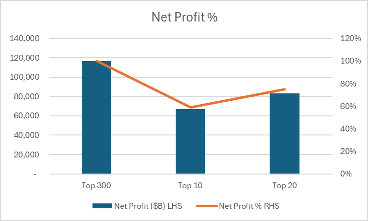 Unlike the overall market where unprofitable stocks account for most of the listed companies the majority of the top 300 stocks are profitable and all of the top 10 and 20 stocks are profitable companies. With the top 10 stocks of the ASX300 accounting for 59% of ASX300 profits and the top 20 stocks account for 75% of ASX300 profits.