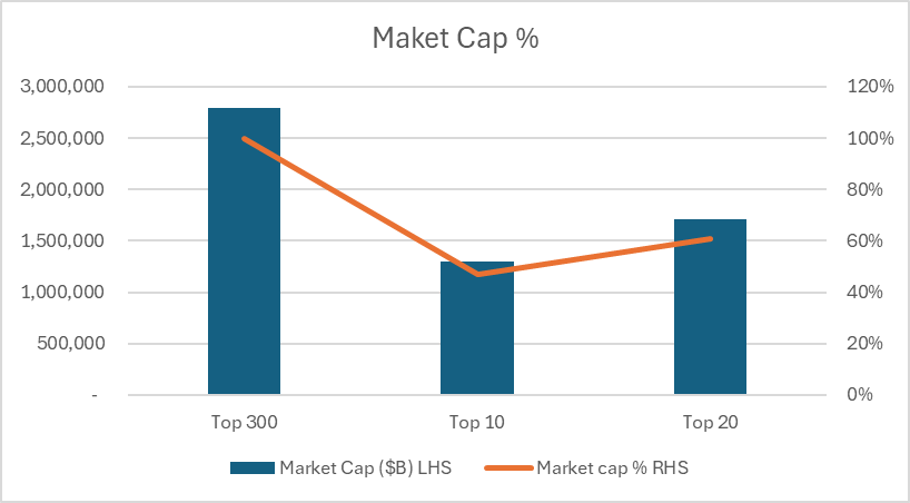 | Market Cap ($B) LHS | Market cap % RHS | |