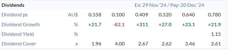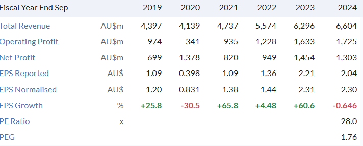 Given this performance it’s not surprising to see NPAT increase from $699m in FY19 to $1.3b in FY24. During this time and on the back of this strong financial performance, ALL’s share price has gone from $22.00 in FY19 to $65.00 at the time of writing.