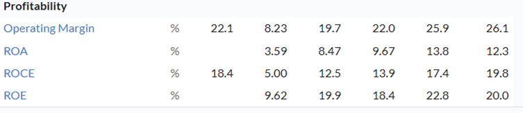 Over the last 6-years ALL has increased revenue and earnings while maintaining an operating margin in the low to mid 20s. This has also help contributed to their strong returns on equity, assets, and capital employed.