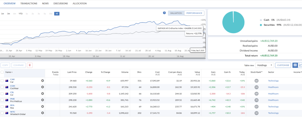 Concentrated portfolio that is focused on growth. The aim of the portfolio is to try and outperform the market (ASX All Ordinaries) by concentrating the portfolio over six high quality stocks.